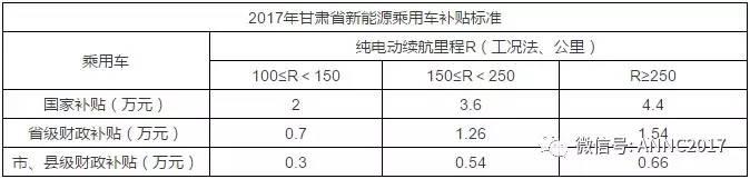 4月10日,甘肃省财政厅等三部门发布《关于调整省级新能源汽车推广应用财政补贴政策》。2017年1月1日之后(含当日)在省内购买的符合补贴申请条件的新能源汽车,财政补贴调整为:省级财政按照调整后的中央财政补贴标准的35%执行,市(州)、县(市、区)财政按照调整后的中央财政补贴标准的15%执行,省、市、县补贴比例总和为中央财政补贴的50%。中央财政和地方财政新能源汽车财政补贴总额不超过购车价款的50%。